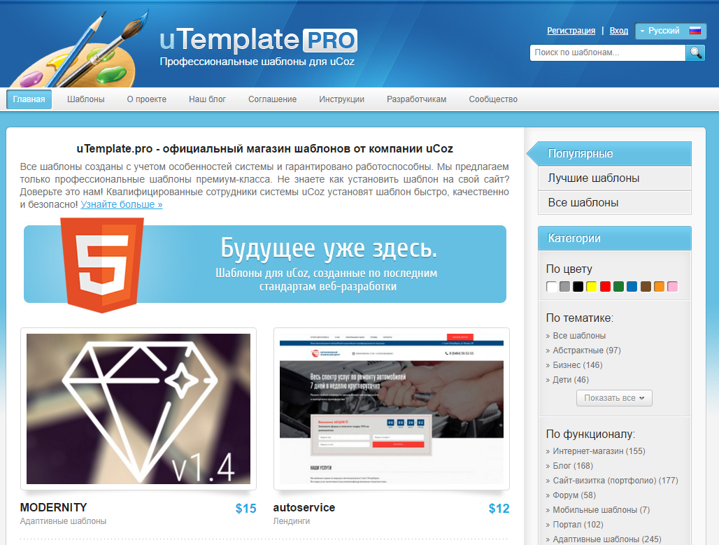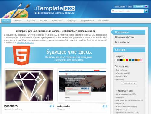 Магазин шаблонов uTemplate — это отличный способ получить современный, а в некоторых случаях и уникальный, дизайн для сайта. Количество шаблонов уже перевалило за полтысячи, и их число неуклонно растет. В магазине можно найти бесплатные шаблоны.
