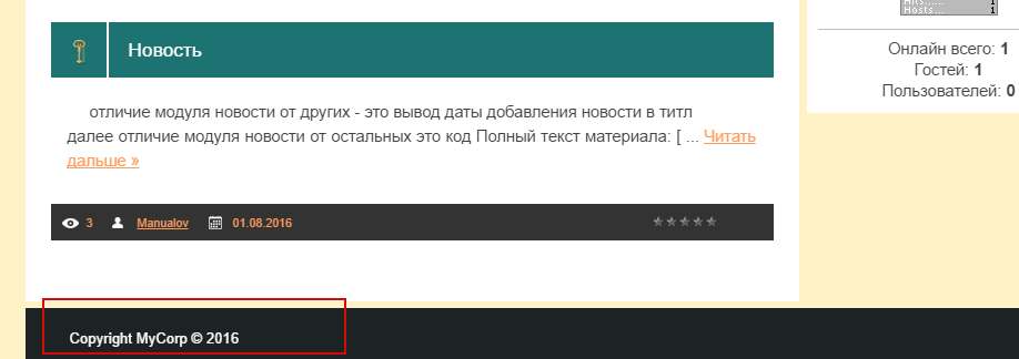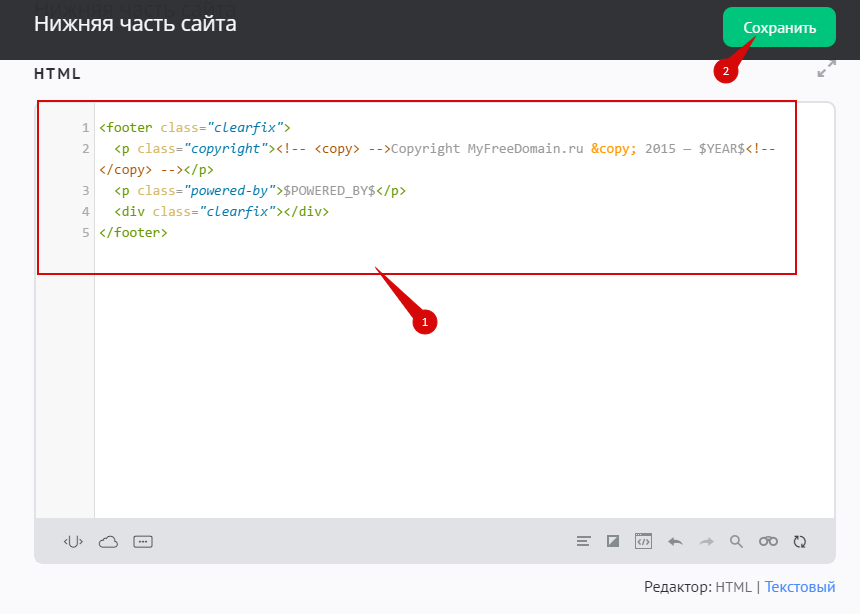 В инструкции рассмотрено, как изменить надпись в нижней части сайта (футере). По умолчанию там расположен следующий текст: