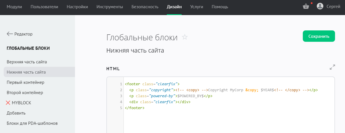- Редактированием глобального блока «Нижняя часть сайта». Перейдите в Панель управления / Дизайн / Редактор / Глобальные блоки / Нижняя часть сайта.