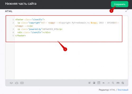 Независимо от выбранного способа, откроется форма редактирования глобального блока «Нижняя часть сайта»: