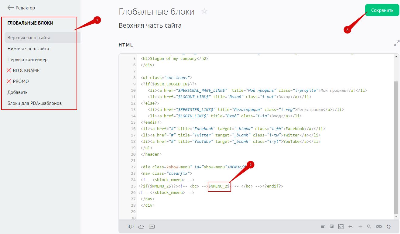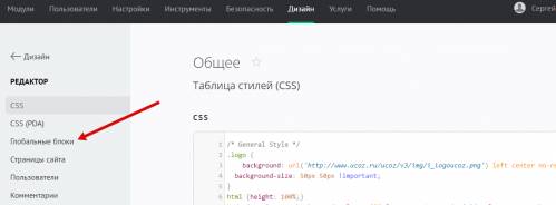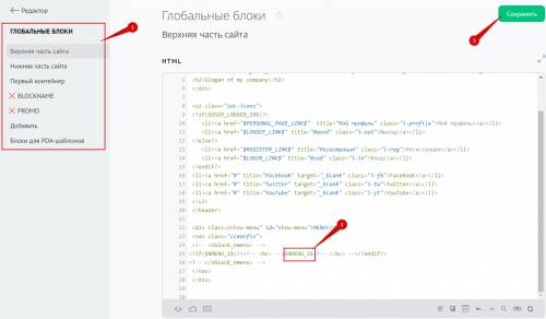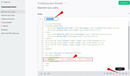 В других случаях в панели управления нужно перейти в «Дизайн» / «Редактор» / «Глобальные блоки» и найти переменную в коде шаблона «Верхняя часть сайта»: