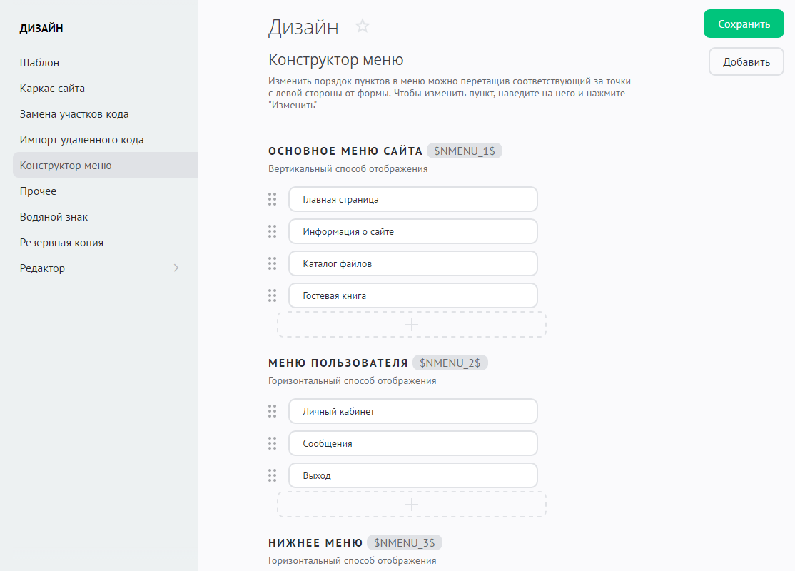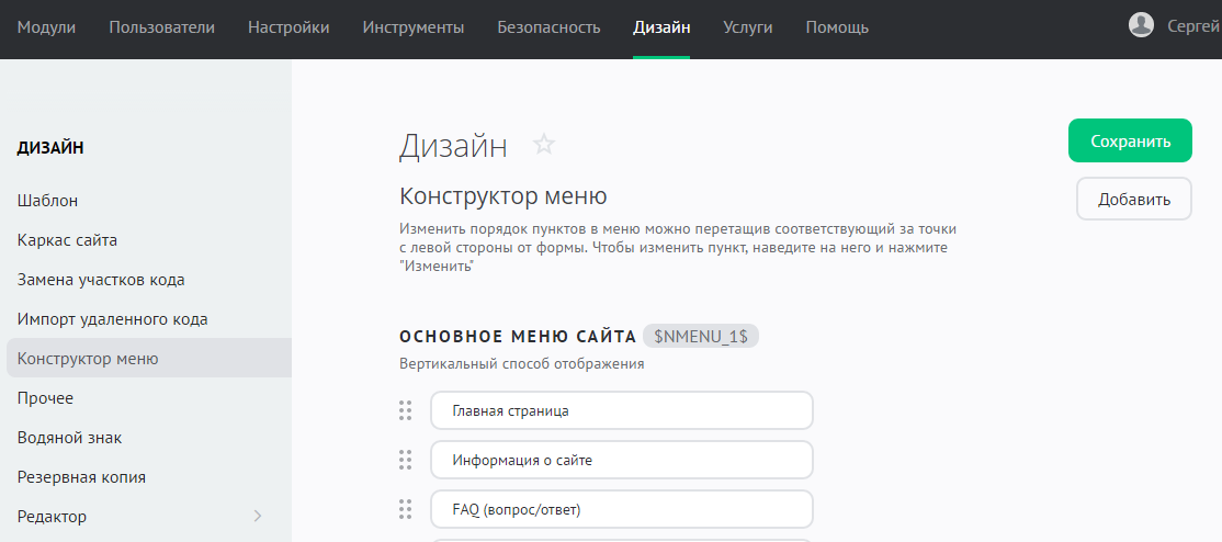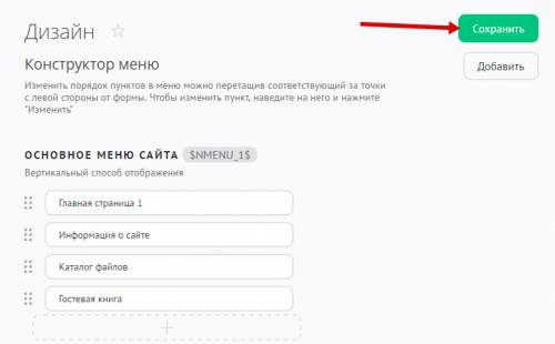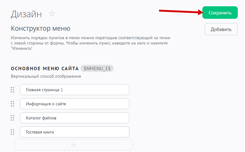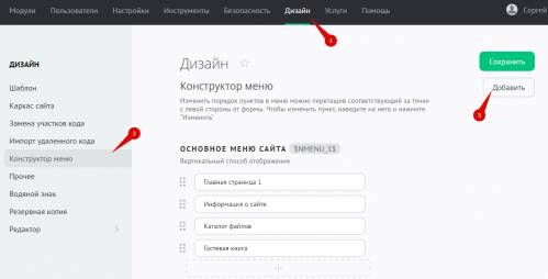 Чтобы создать новое меню, в панели управления откройте раздел «Дизайн» / «Конструктор меню» и нажмите на кнопку «Добавить»: