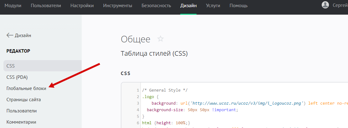 В панели управления откройте раздел «Дизайн» / «Редактор» и найдите в меню слева «Глобальные блоки»: