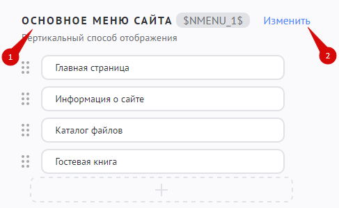 Меню сайта — один из основных функциональных элементов, состоящий из набора ссылок на ключевые страницы. По умолчанию в него входят ссылки на активные модули и стандартные страницы («Информация о сайте», «Обратная связь»). Конструктор меню позволяет изменить набор ссылок без редактирования HTML-кода шаблонов сразу для всех страниц сайта.