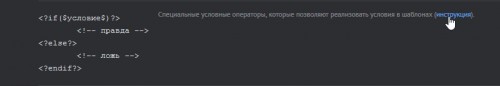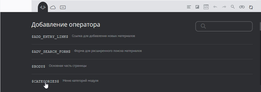 Добавление оператора. В каждом отдельном шаблоне работает определенный набор системных операторов. Нажав на кнопку “Добавить $КОД$”, вы увидите список и функциональное описание операторов, работающих в выбранном вами шаблоне (для разных шаблонов списки могут отличаться).