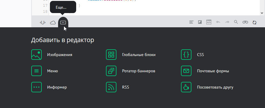 Меню, с помощью которого можно добавлять в шаблон различные элементы и инструменты, такие как меню, форма обратной связи, RSS-лента, изображение и др. Выделите нужное место в шаблоне, выберите необходимый элемент, и вы получите готовый код элемента в шаблоне.