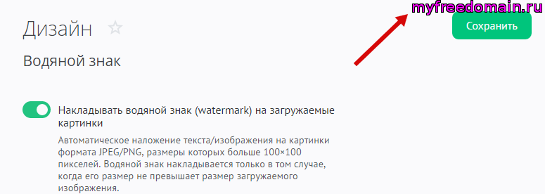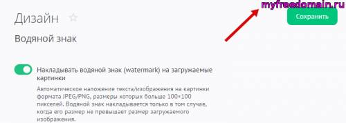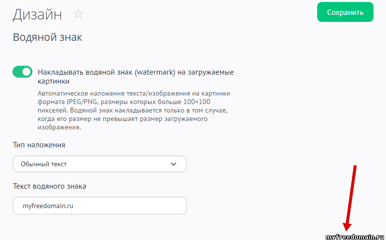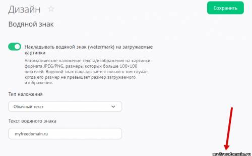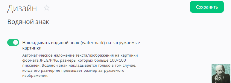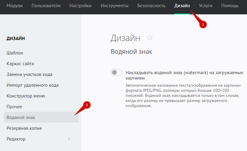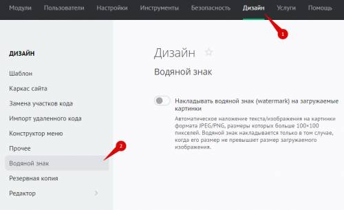Чтобы управлять наложением водяного знака на изображения, в панели управления откройте «Дизайн» / «Водяной знак»: