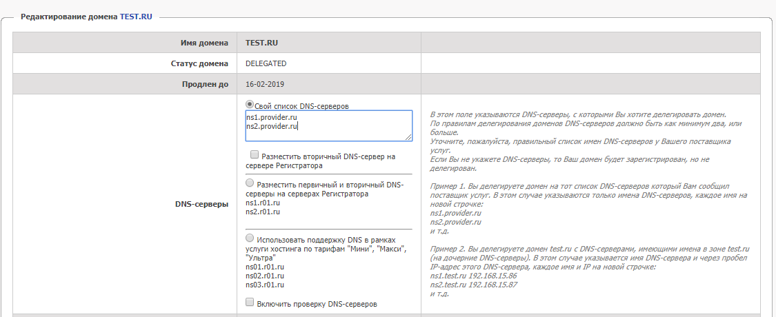 Через несколько минут после постановки задания в очередь вам придет уведомление по e-mail об успешном делегировании домена на DNS-серверах Регистратора: ns1.r01.ru и ns2.r01.ru.