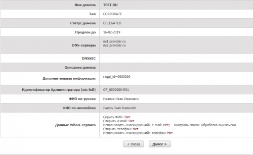 Если выбрать «Открыть данные», в базе Whois появятся контакты, указанные Администратором при регистрации домена, например: