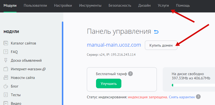 Чтобы купить домен, перейдите по ссылке на главной странице панели управления или выберите в разделе «Услуги» пункт «Купить домен»: