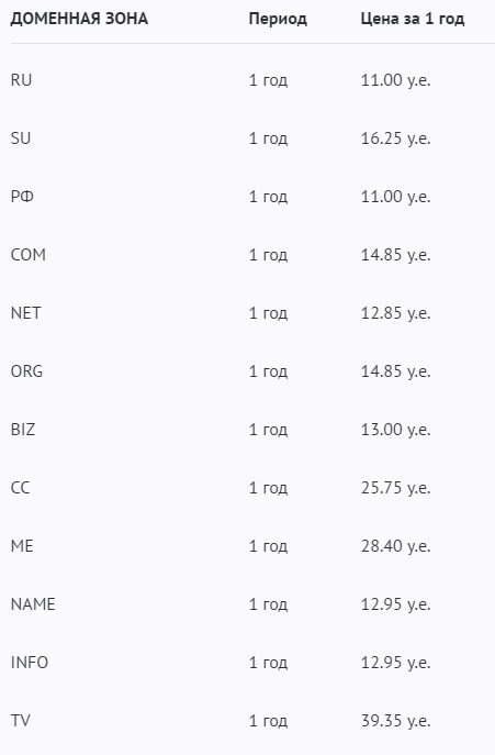 Стоимость покупки домена на один год зависит от доменной зоны и указана в таблице:
