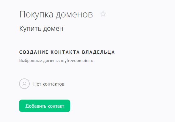 Вам потребуется указать контактные данные владельца. Это стандартная процедура при регистрации доменов. Нажмите на кнопку «Добавить контакт» и заполните следующую форму: