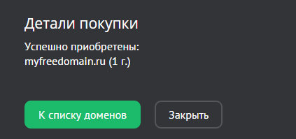 Нажмите на кнопку «Зарегистрировать», и, если всё прошло успешно, вы увидите сообщение о приобретении домена: