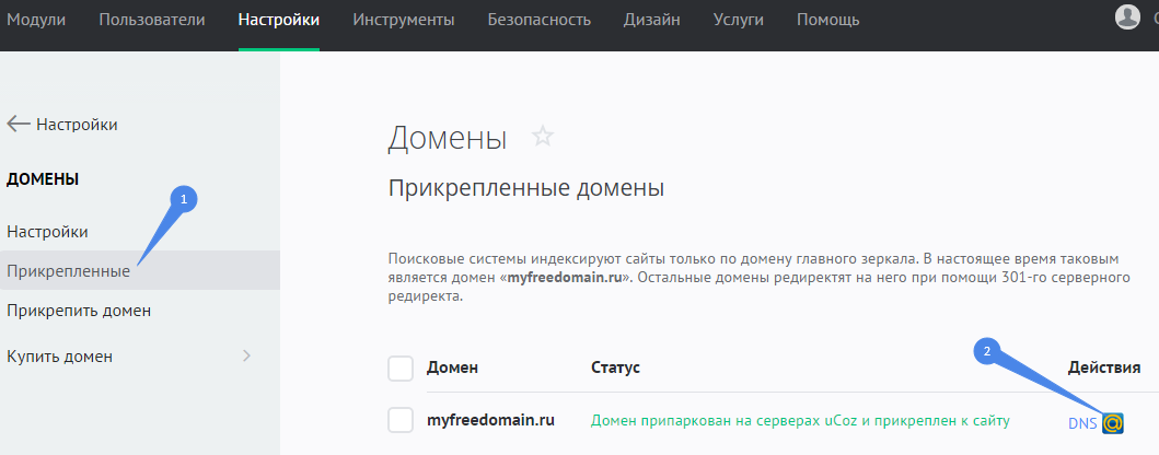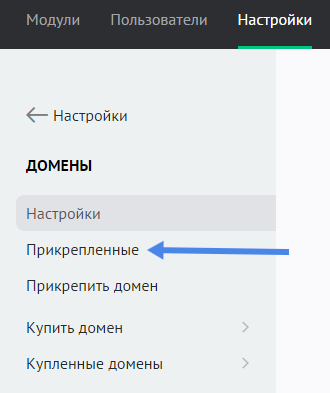 Откройте панель управления сайтом. Перейдите в раздел «Настройки» и в левой колонке выберите пункт «Домены»: