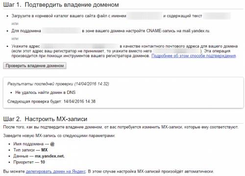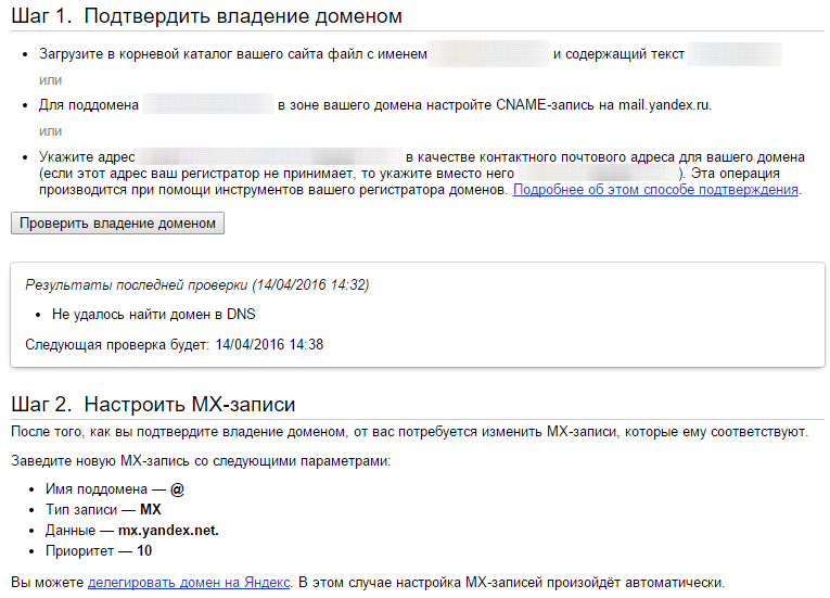Здесь вам нужно подтвердить владение доменом («Шаг 1») и добавить MX-записи («Шаг 2»).
