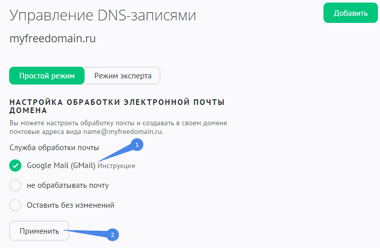 В разделе «НАСТРОЙКА ОБРАБОТКИ ЭЛЕКТРОННОЙ ПОЧТЫ ДОМЕНА» выберите «Google Mail (GMail)» и нажмите на кнопку «Применить»: