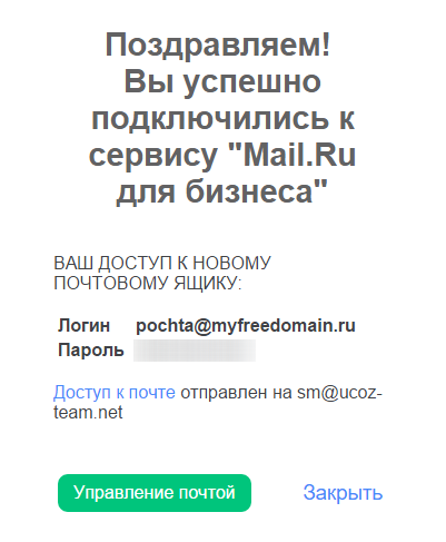 После этого вы увидите сообщение о том, что почтовый ящик создан. На экране будет отображена информация для входа в почтовый ящик:
