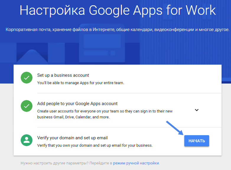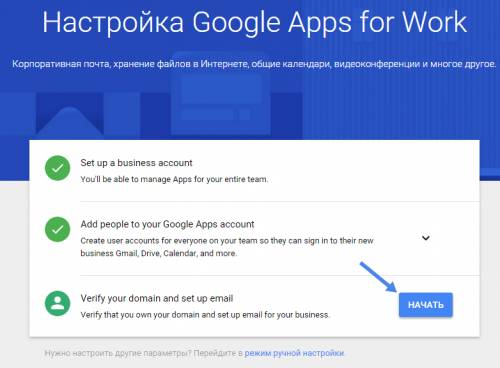 Далее перейдите в сервис Google Apps и нажмите на кнопку «Начать здесь»: