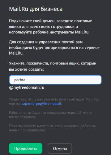 Укажите имя почтового ящика, который хотите создать, и нажмите на кнопку «Продолжить»: