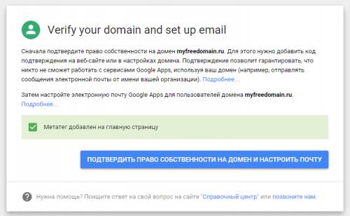 После успешной регистрации нужно подтвердить право владения доменом: