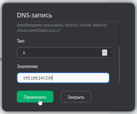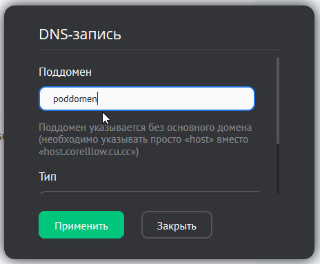 Далее выберите Тип A - В поле “Значение” введите IP сайта, к которому будет прикреплен поддомен - Для завершения нажмите на кнопку “Применить”.