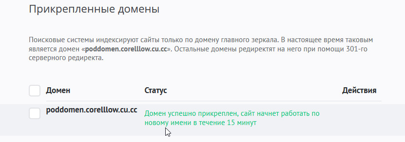 После прикрепления вы увидите в списке доменов прикреплённый поддомен, а также надпись об успешном прикреплении: “Домен успешно прикреплён, сайт начнет работать по новому имени через 15 минут”.