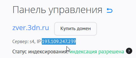 Сервер, на котором расположен сайт, и его IP можно узнать в панели управления сайтом на главной странице.