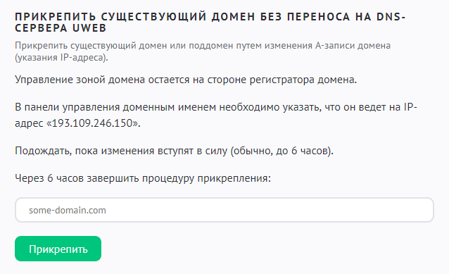 Авторизуйтесь в панели управления сайтом, к которому нужно прикрепить поддомен: Настройки - Системные - Домены - Прикрепить домен - Прикрепить существующий домен без переноса на DNS-сервера uWeb - Введите имя поддомена и основной домен - Нажмите “Прикрепить”.