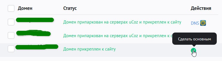 В списке доменов напротив второстепенных доменов будут стоять зелёные галочки, с помощью которых можно перевести второстепенный домен в основной.