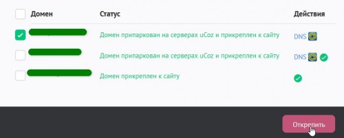 В списке сайтов напротив основного зелёной галочки стоять не будет. Выберите домен в списке и нажмите на кнопку “Открепить”.