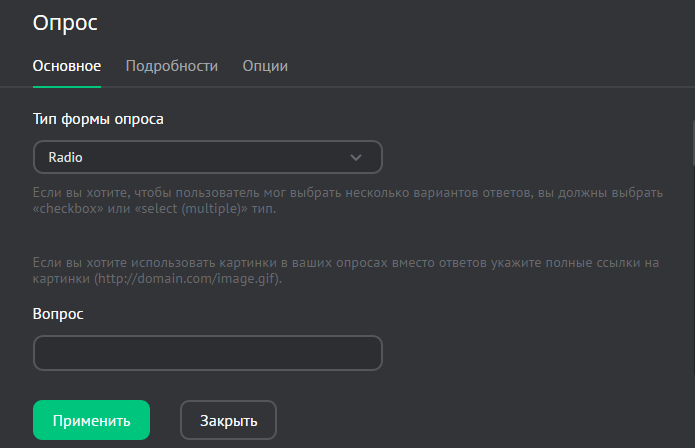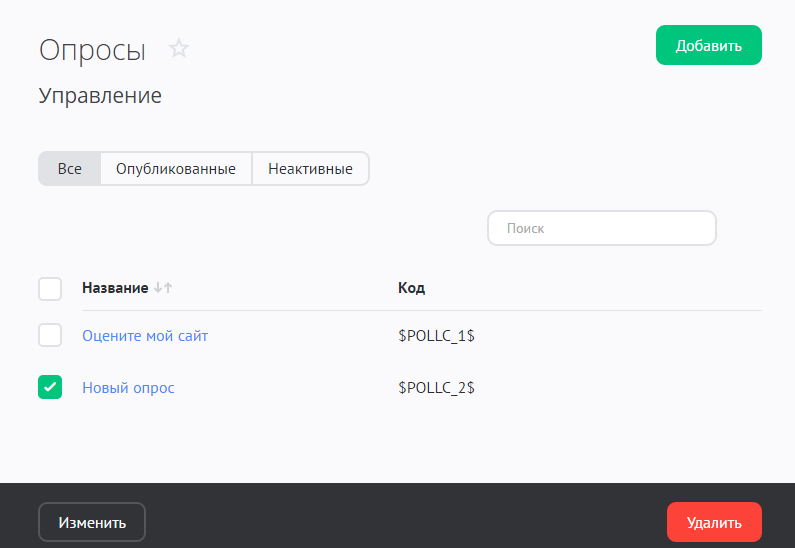 - Активный опрос. Опция регулирует показ опроса на сайте. Неактивные опросы будут скрыты.