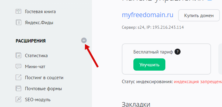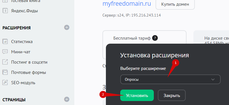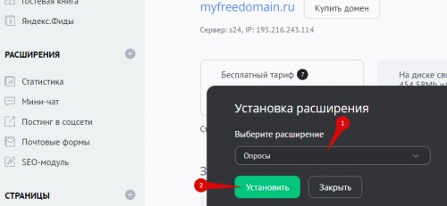 Чтобы создать новый опрос, перейдите в раздел расширения «Опросы». Для этого выберите «Опросы» из списка расширений. Если расширения нет в списке, установите его, нажав на «+»: