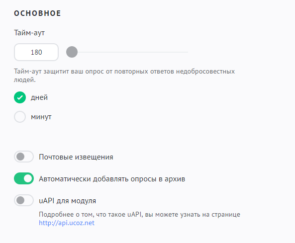 Тайм-аут защитит опрос от повторных ответов и чрезмерного голосования. Допустимые значения от — 0 до 9999 дней/минут. 0 — без ограничений.