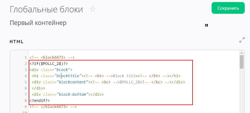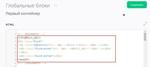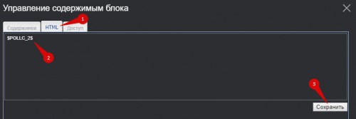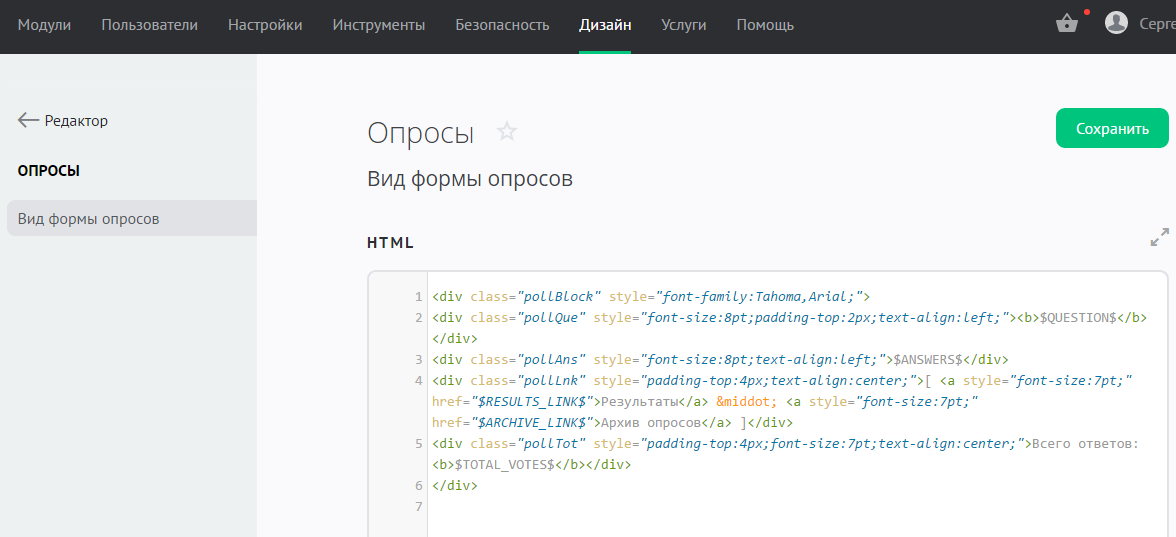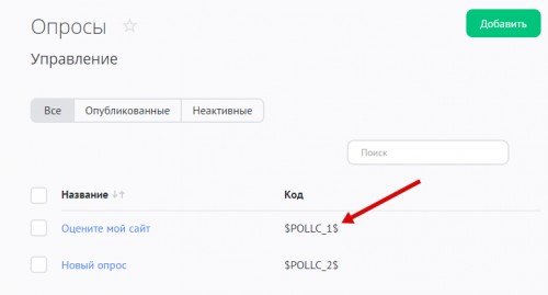 - Код. Размещается в шаблоне и отвечает за вывод конкретного опроса на страницах сайта.