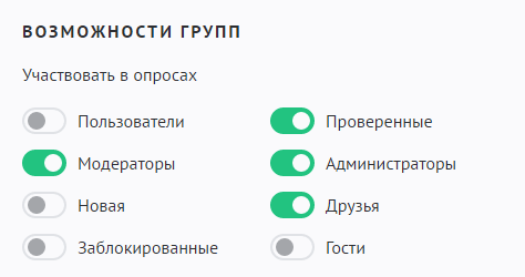 Опция «Участвовать в опросах» задает перечень групп, которые могут принимать участие в опросах. Для отключенных групп голоса не будут засчитаны.