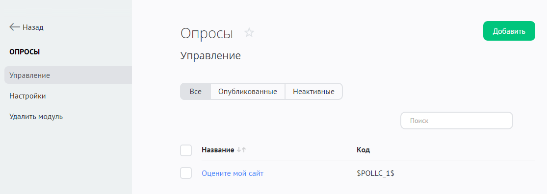 На странице управления опросами представлен список добавленных ранее опросов (по умолчанию в расширении присутствует один опрос «Оцените мой сайт»):