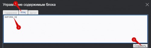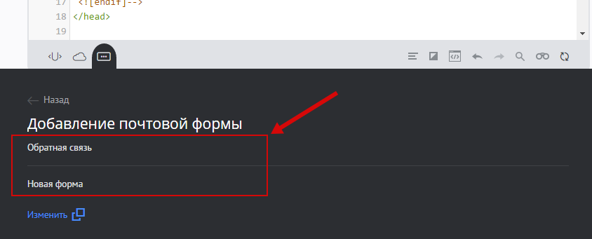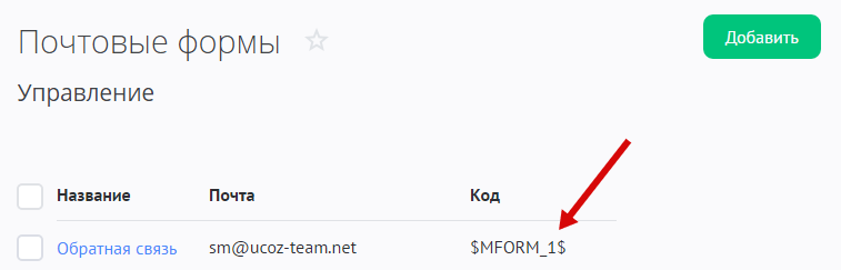 - Переменная, которая выводит почтовую форму в шаблоне. После размещения переменной в шаблоне все изменения, внесенные в настройках формы, автоматически отобразятся на сайте.