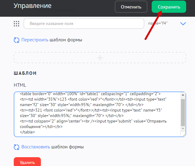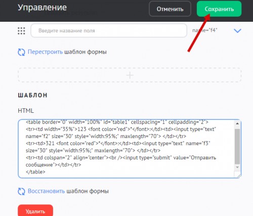 Нажмите на нее, чтобы в поле «Шаблон» был добавлен HTML-код формы. Если вы не планируете менять дизайн формы, то после создания полей формы можете переходить к размещению формы на сайте.