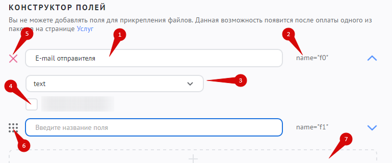 - Тип поля: text, textarea, checkbox, radio, select, security code. Тип поля file появляется после оплаты одного из пакетов услуг. Такое поле позволяет прикреплять файлы к почтовой форме размером до 10 Мб.