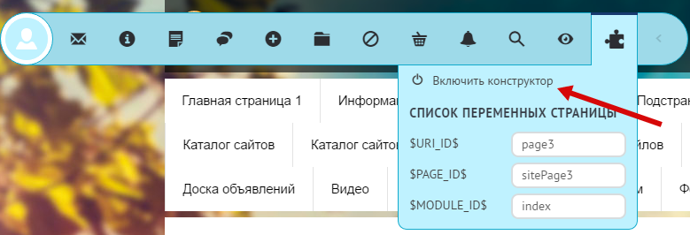 Переменную можно разместить с помощью конструктора в панели инструментов сайта: