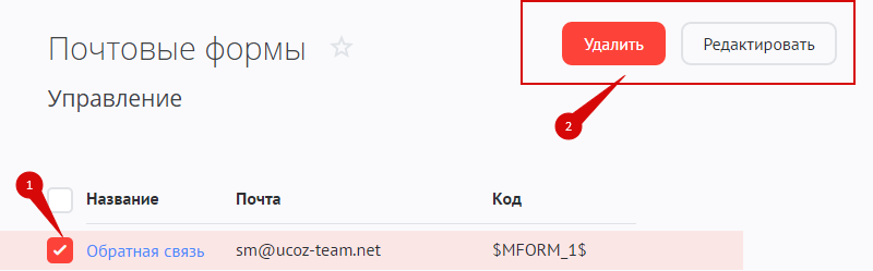 На странице управления представлен список почтовых форм (по умолчанию добавлена одна почтовая форма):