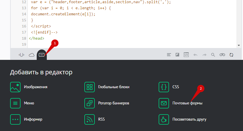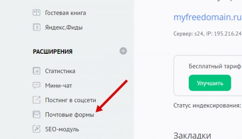 Другой способ размещения: перейдите в «Дизайн» / «Редактор» и в подходящем шаблоне выберите «Почтовые формы»: