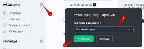 Чтобы создать новую почтовую форму, перейдите в раздел расширения с главной страницы панели управления. Для этого выберите «Почтовые формы» из списка расширений. Если расширения нет в списке, установите его, нажав на «+»: