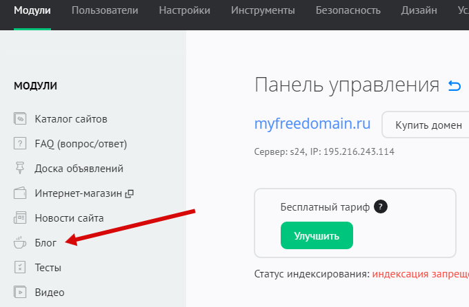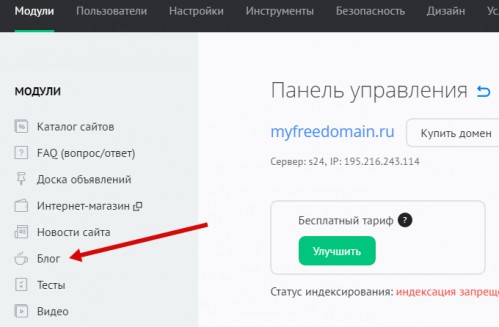 В панели управления сайтом выберите модуль «Блог» из списка: