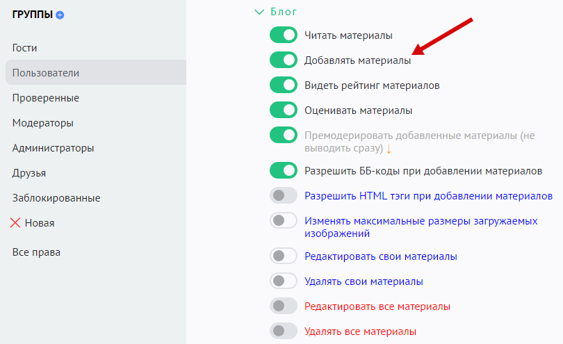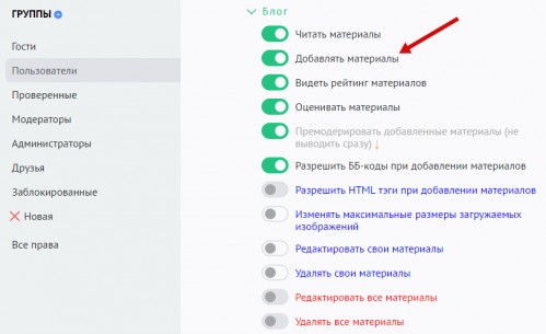 В разделе «Пользователи» / «Группы» выберите группу пользователей, которой хотите предоставить возможность добавления новостей. В разделе прав «Блог» включите опцию «Добавлять материалы»: