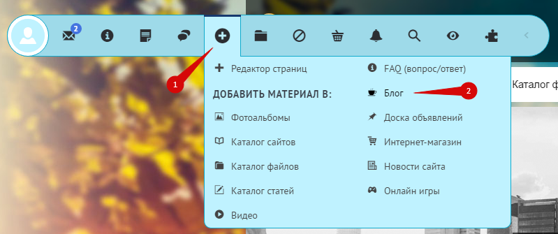 Панель инструментов содержит раздел, который позволяет быстро переходить к добавлению материалов на сайт. Нажмите по иконке «+» и выберите модуль, в который хотите добавить материал: