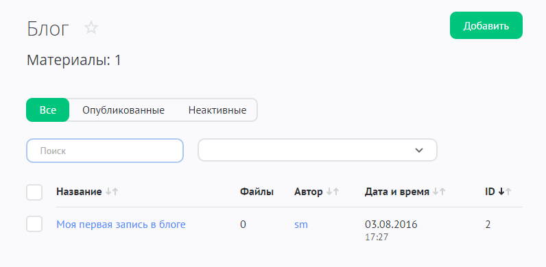 - Дату добавления материала. Датой добавления материала (в том числе неактивного) считается дата его создания. Чтобы изменять это вручную, включите опцию «Выбирать дату добавления материала» в настройках модуля