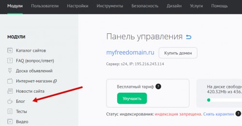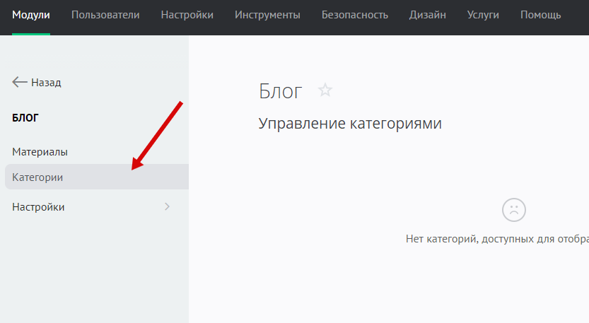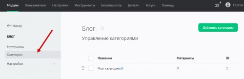В панели управления сайтом перейдите в раздел модуля «Блог» - «Категории»: