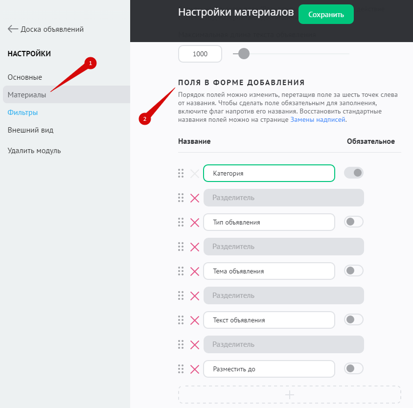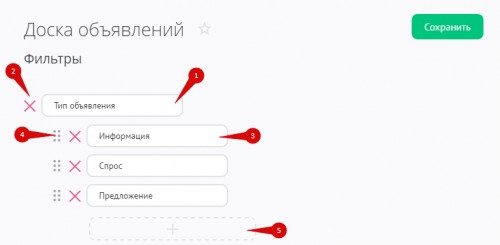 Когда завершите ввод значений для фильтра, нажмите на кнопку «Сохранить». При необходимости повторите действия и добавьте еще фильтр. В модуле «Доска объявлений» может быть создано три фильтра.