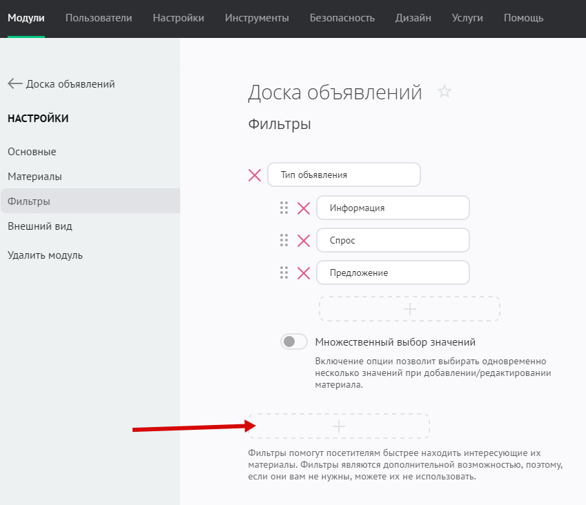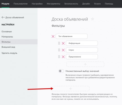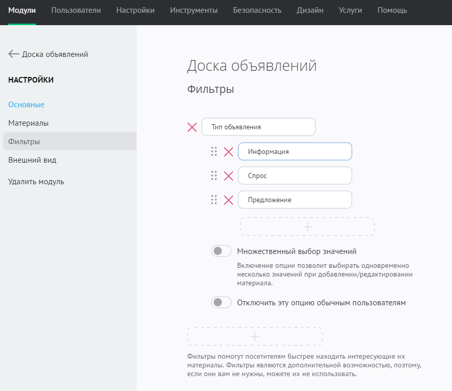 Чтобы создать фильтр, зайдите в «Модули» / «Доска объявлений» / «Настройки» и выберите слева пункт «Фильтры». Откроется страница: